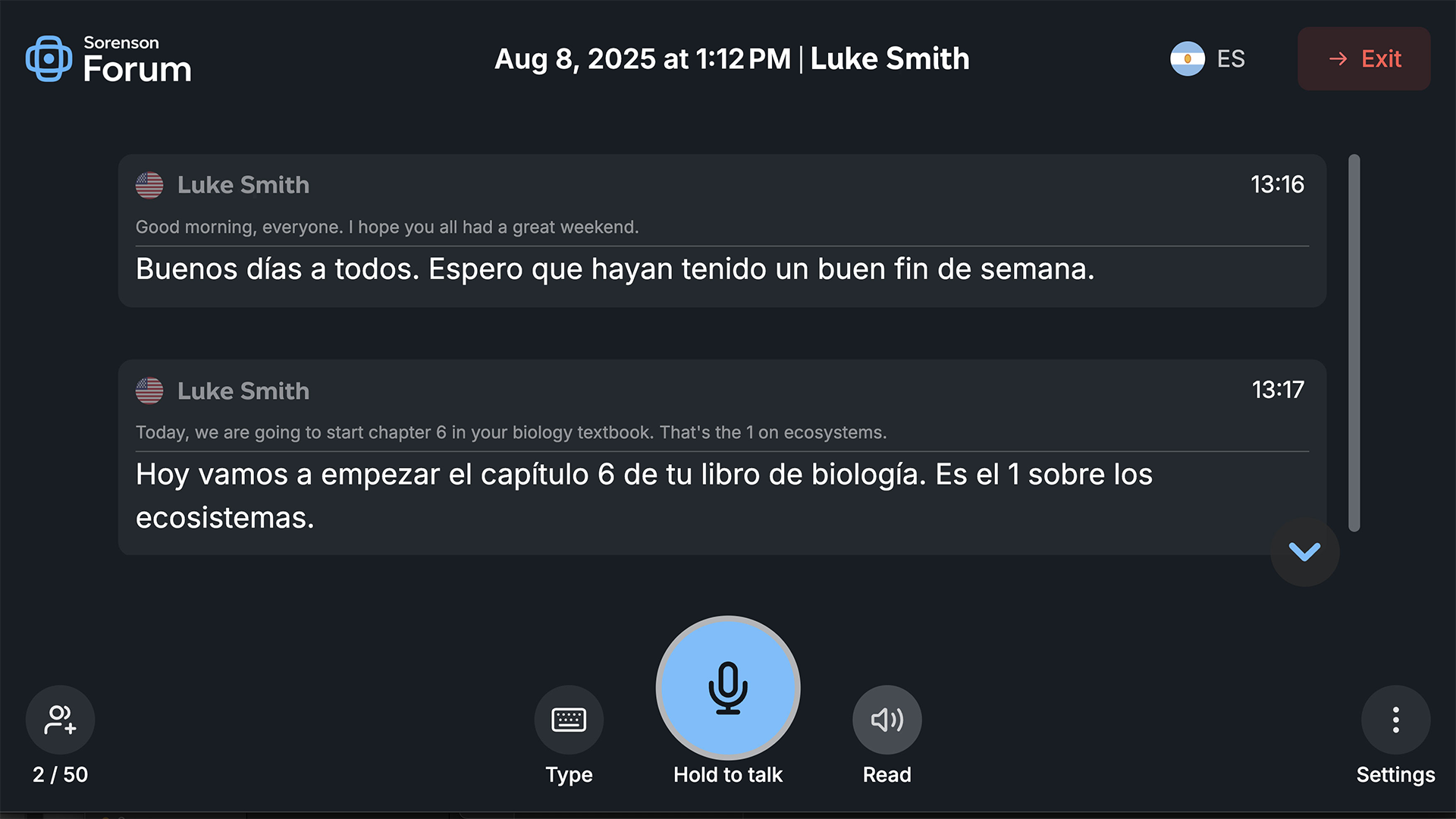 Each participants joins on their device, selects their language, and can follow along with captions and AI text-to-speech.